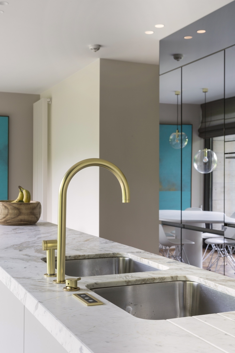 De vraag van de bouwheer was om keuken, nachthallen, bureau en souterrain op te frissen met een grote focus op lichtinval. Het gebruik van lichte kleuren en reflecterende oppervlaktes in combinatie met een geoptimaliseerd lichtplan en integratie van een patio zorgen ervoor dat de ruimtes nu groter aanvoelen. Af en toe schuilt er een speels detail achter een hoekje, passend voor het gezin die er leeft.